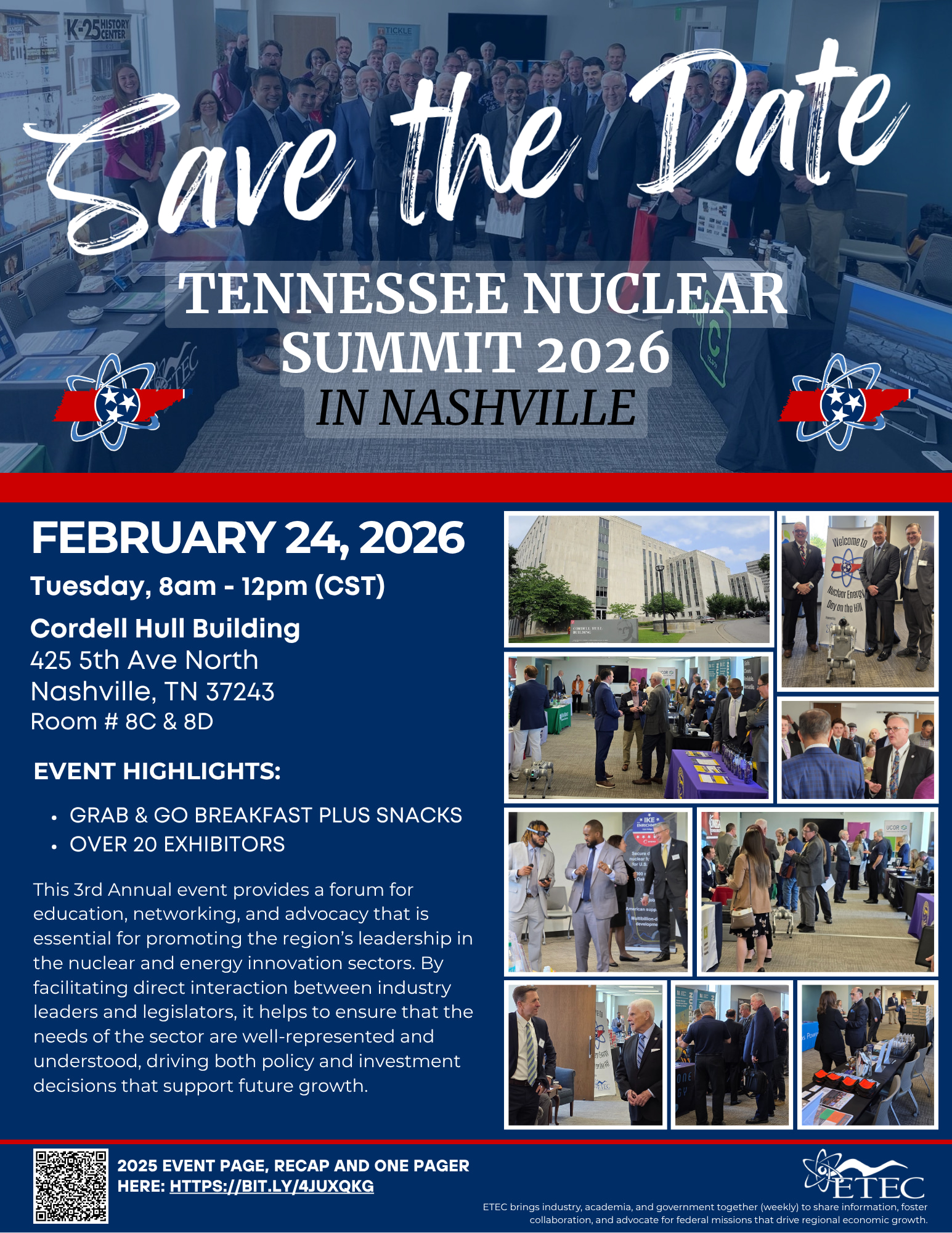 The TN Nuclear Summit for 2026 will provide a forum for education, networking, and advocacy to promote the region’s leadership in the nuclear and energy innovation sectors.
